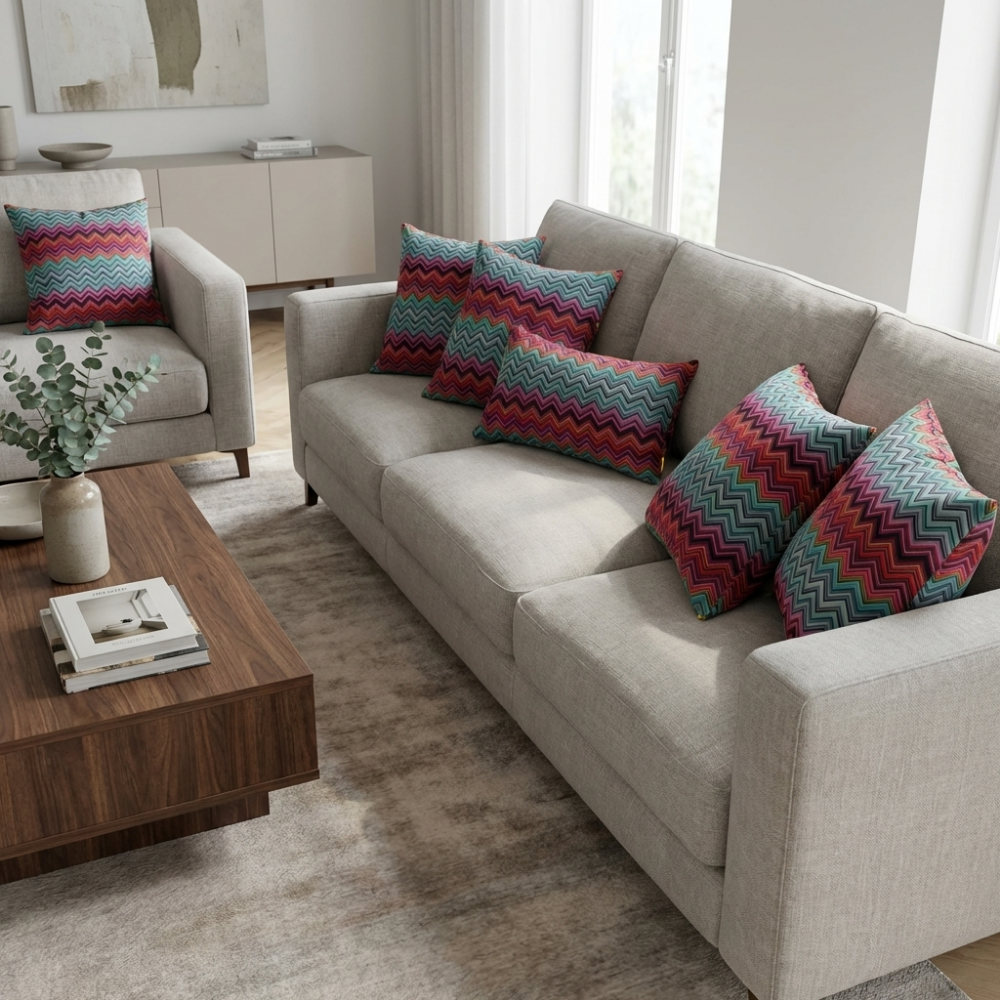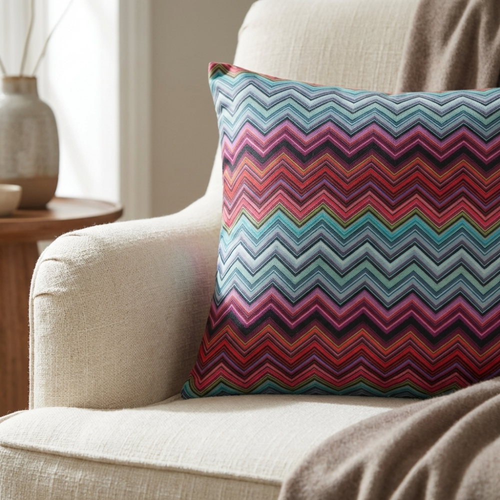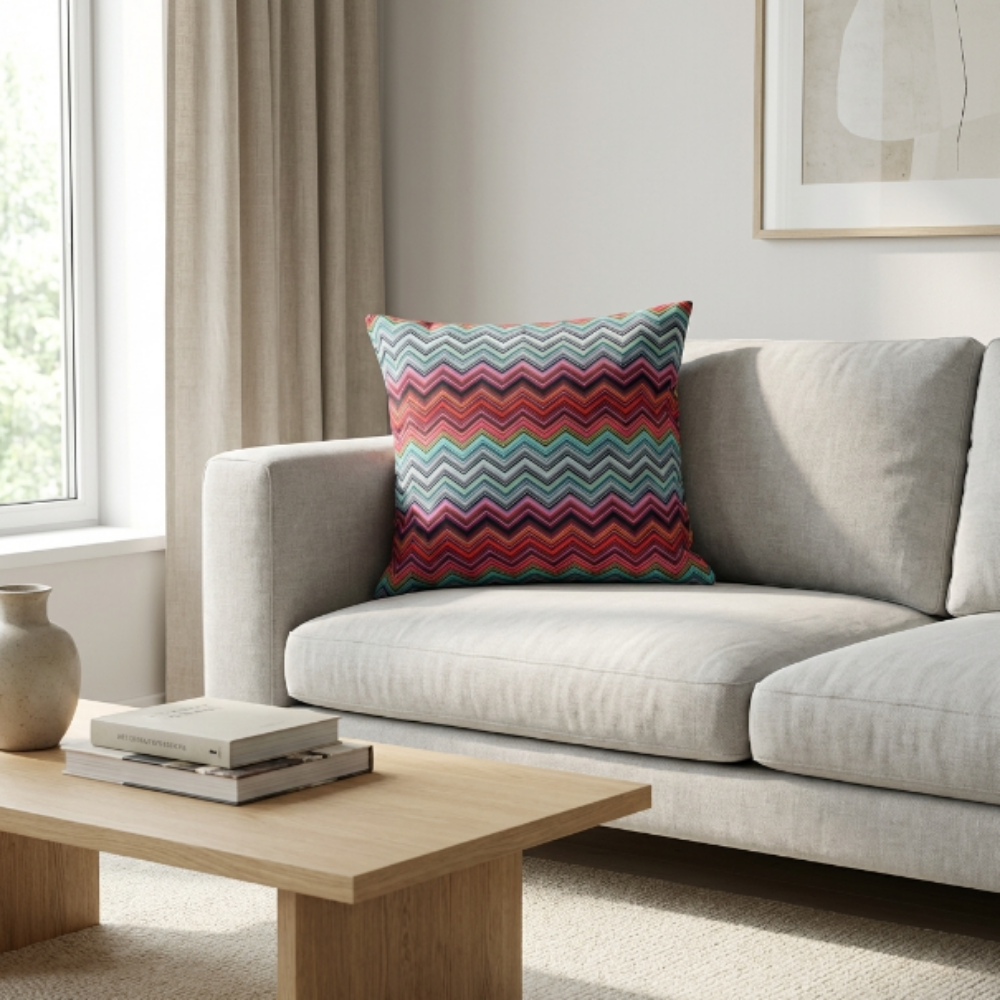 Zigzag desenin dalgalı ve ritmik formu ile renk geçişlerinin uyumu birleşerek mekâna enerjik ve modern bir atmosfer kazandırır. Bu özel tasarım yastık, grafik desen anlayışı ile dikkat çeken ve zamansız bir stil sunan güçlü bir dekoratif parçadır.