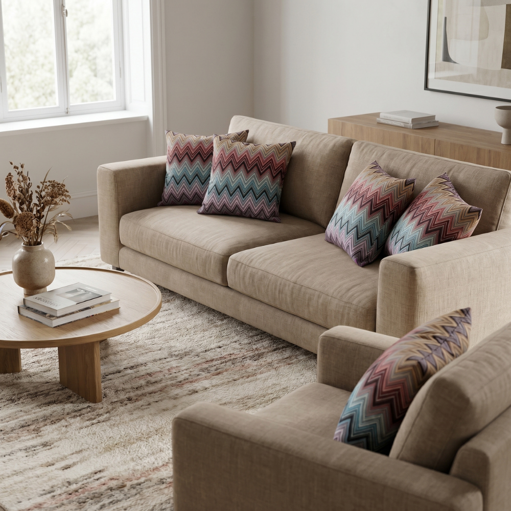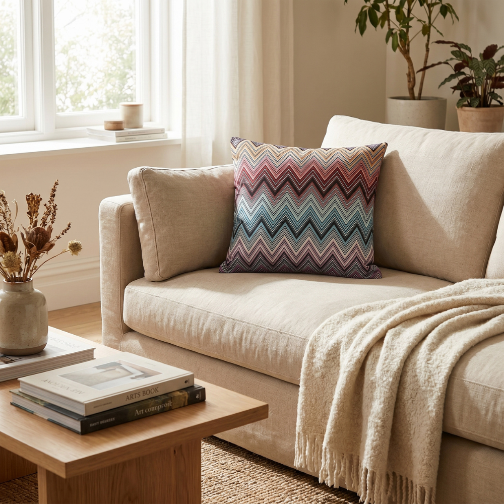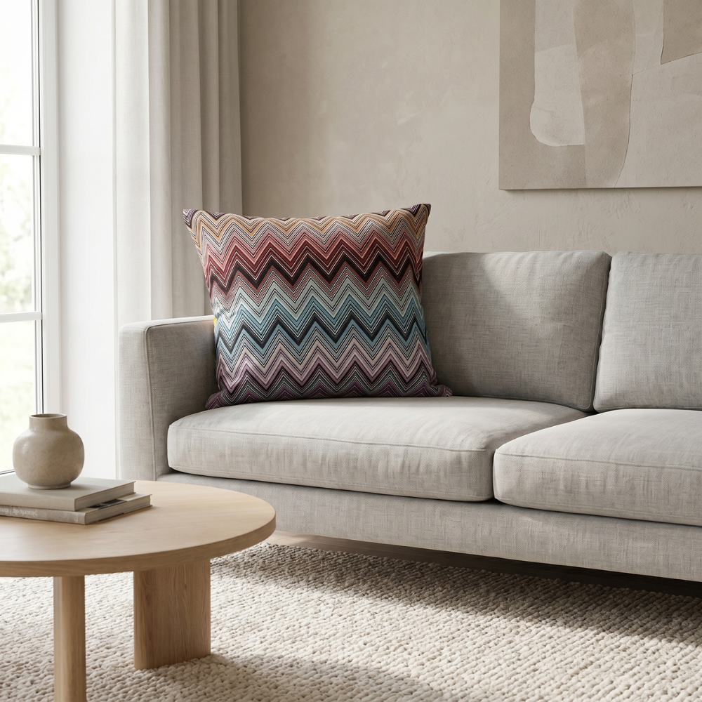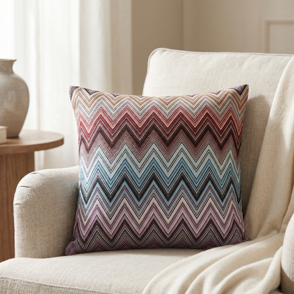 Zigzag (chevron) desenin akıcı geometrisi ile çok renkli geçişlerin dengesi birleşerek mekâna enerjik ve modern bir atmosfer kazandırır. Bu özel tasarım yastık, sanatsal desen yapısı ile dikkat çeken ve zamansız bir stil sunan güçlü bir dekoratif parçadır.