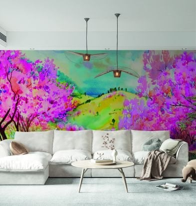 Renkli Dağlar Çiçekli Ağaçlar Duvar Kağıdı