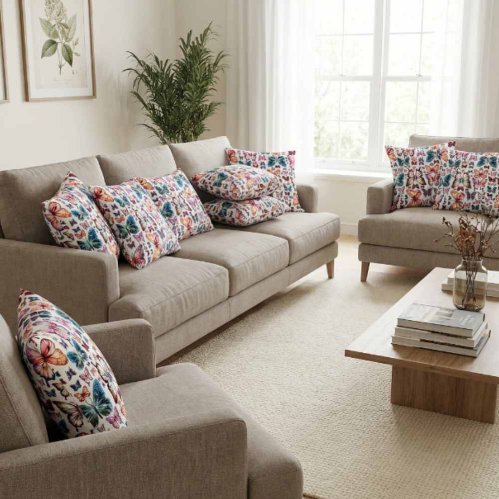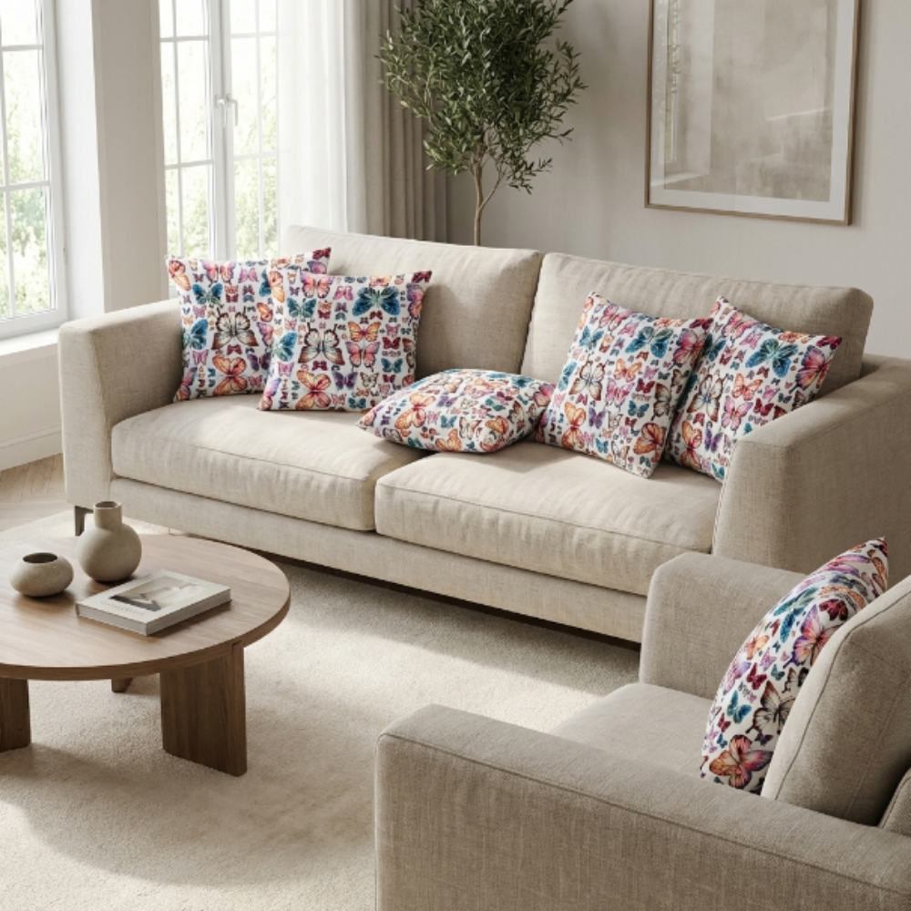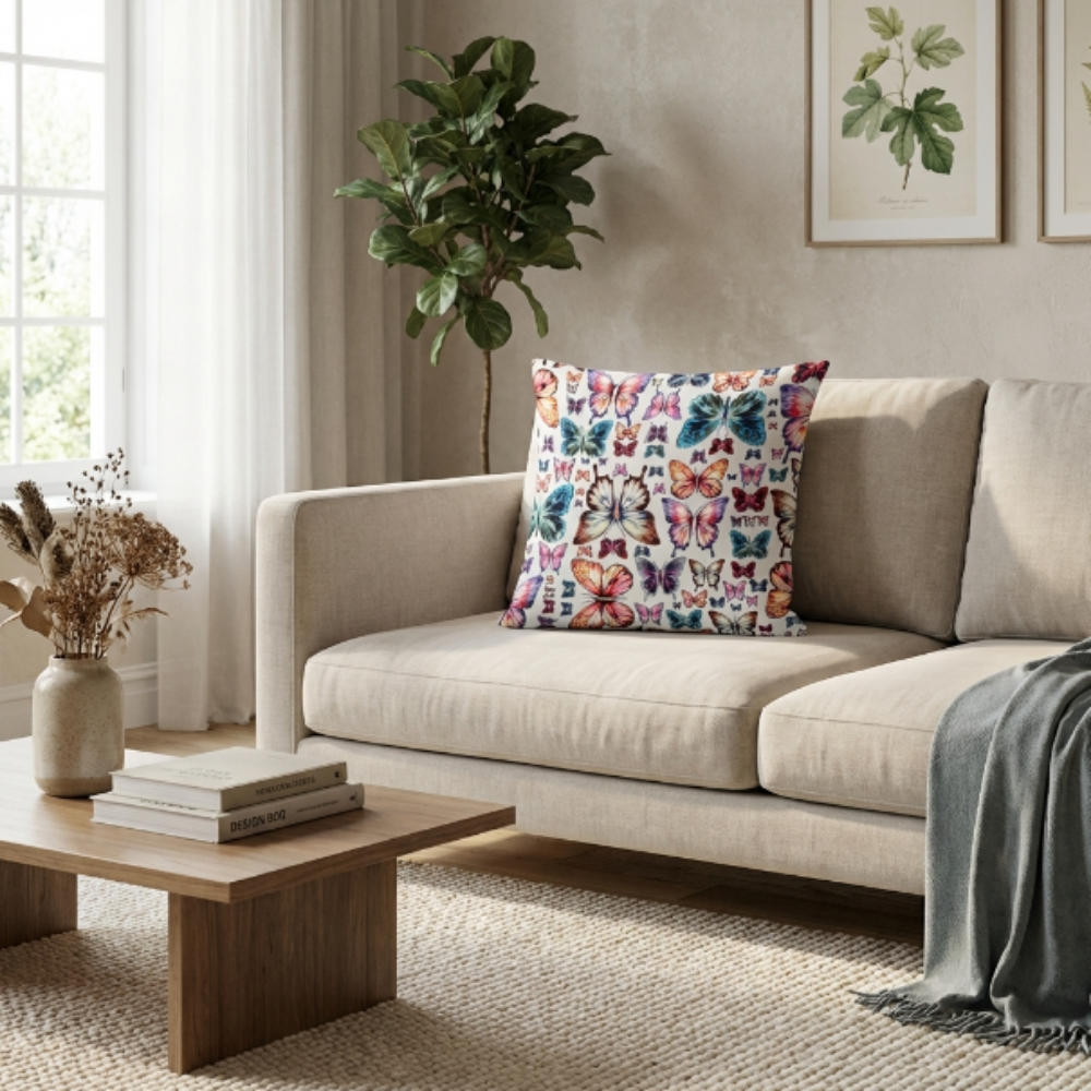 Kelebek figürlerinin zarif ve doğal yapısı, canlı renk geçişleri ile birleşerek mekâna enerjik ve pozitif bir atmosfer kazandırır. Bu özel tasarım yastık, doğadan ilham alan modern çizgisiyle dikkat çeken ve zamansız bir stil sunan dekoratif bir parçadır.