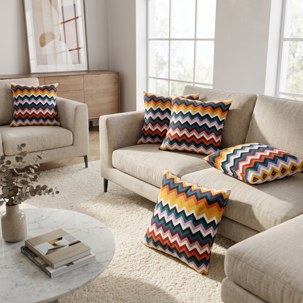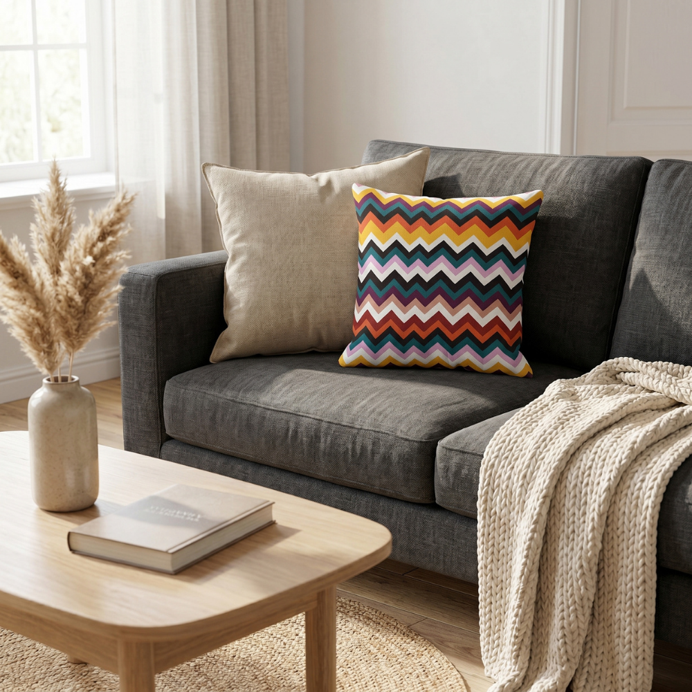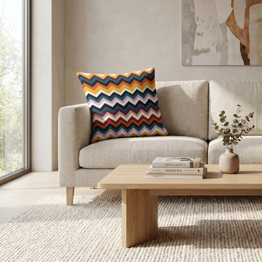 Zigzag (chevron) desenin keskin ve ritmik geometrisi ile çok renkli geçişlerin enerjisi birleşerek mekâna retro ve modern bir atmosfer kazandırır. Bu özel tasarım yastık, eklektik ve dinamik dekorasyon anlayışını destekleyen zamansız bir stil sunar.