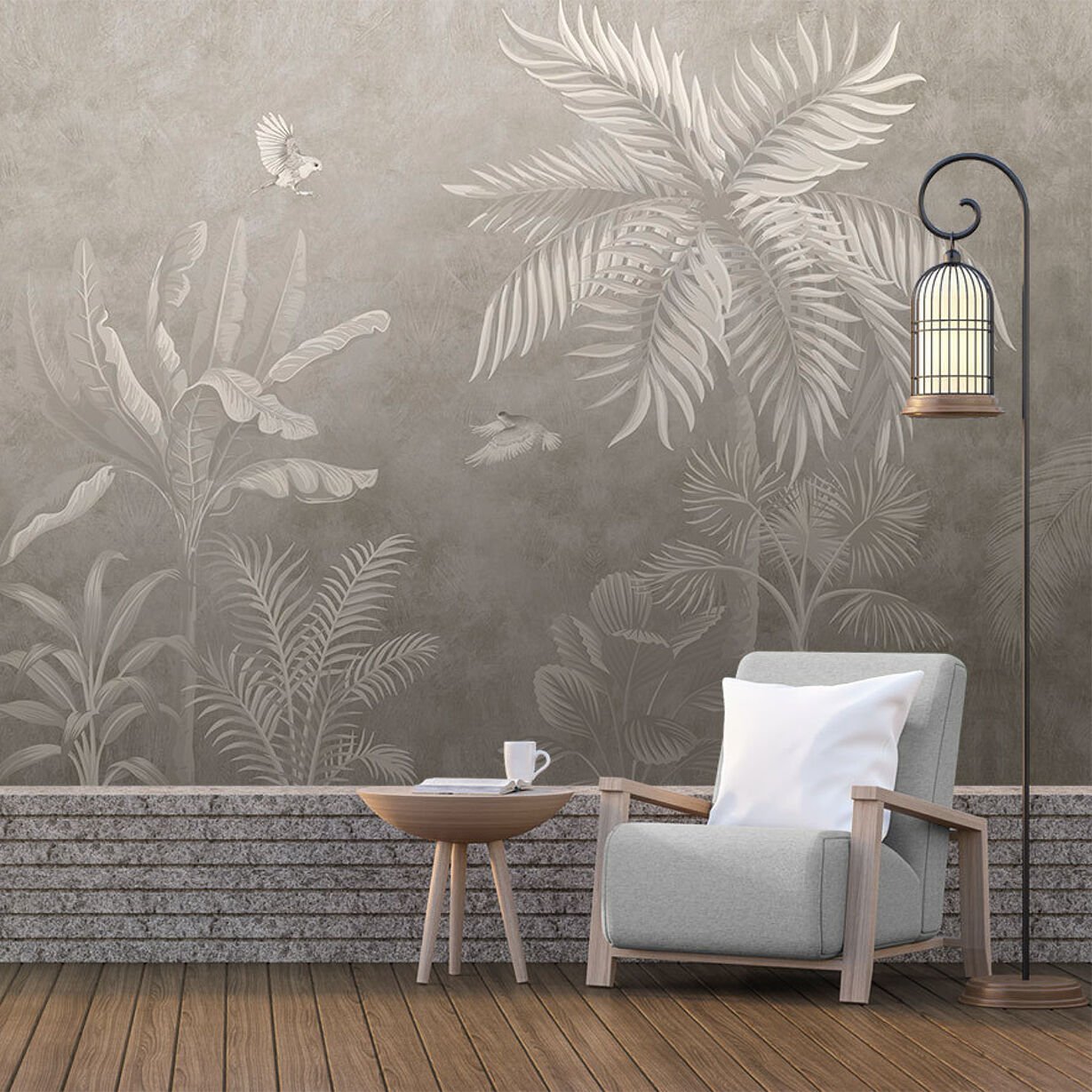 Sepya Gri Beton Zeminde Tropik Bitkiler Duvar Kağıdı