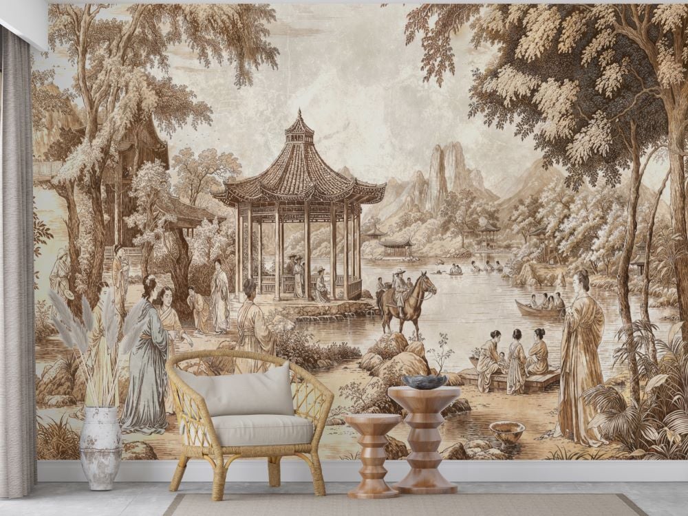 Çin Kültüründen İlham Alan Bu Sepya Tonlardaki Manzara Duvar Kağıdı,Doğaya Ve Sakinliğe Zarafetle Mekanlaraınıza Taşır Zarif Ve Zamansız Bir Atmosfer Yaratmak İsteyenler İçin Tasarlanan Bu Çin Esintili Sepya Duvar Kağıdı,Doğa Manzaraları,Geleneksel Kıyafetli Figürler Ve Detaylı Mimari Öğelerle Bezeli Eşsiz Bir Sahne Sunar.