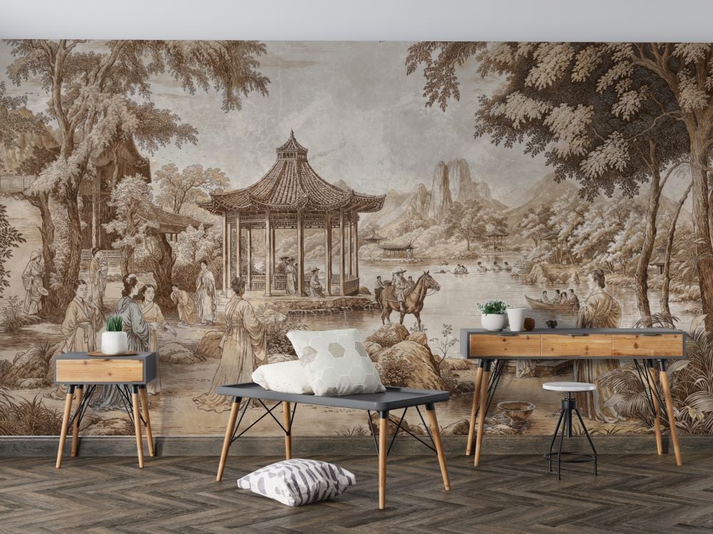 Sepya Tonlarda Çin Tarzı Geleneksel Sanat Deseni Duvar Kağıdı