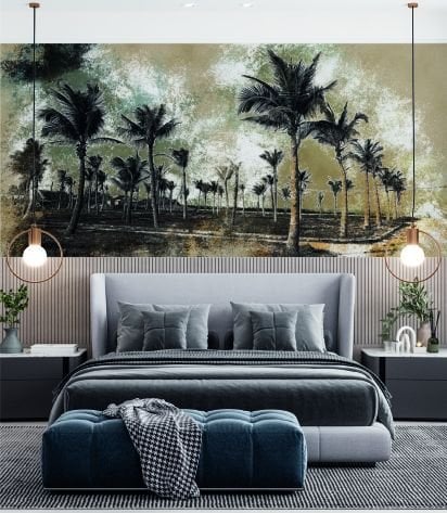 Sepya Zeminde Siyah Çizim Palmiye Ağaçları Duvar Kağıdı
