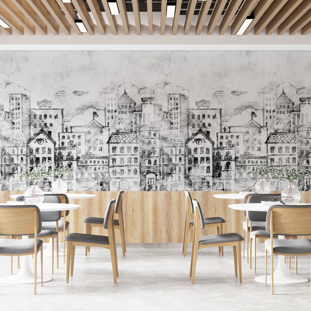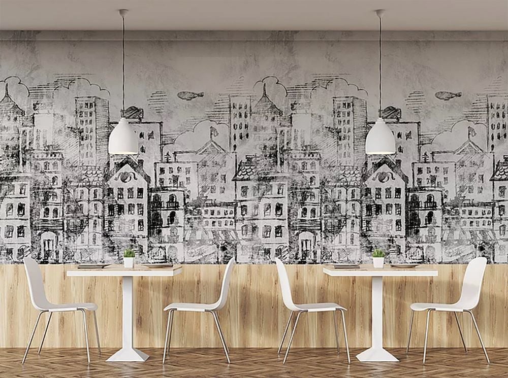 Siyah Beyaz Çizim Binalar Duvar Kağıdı
