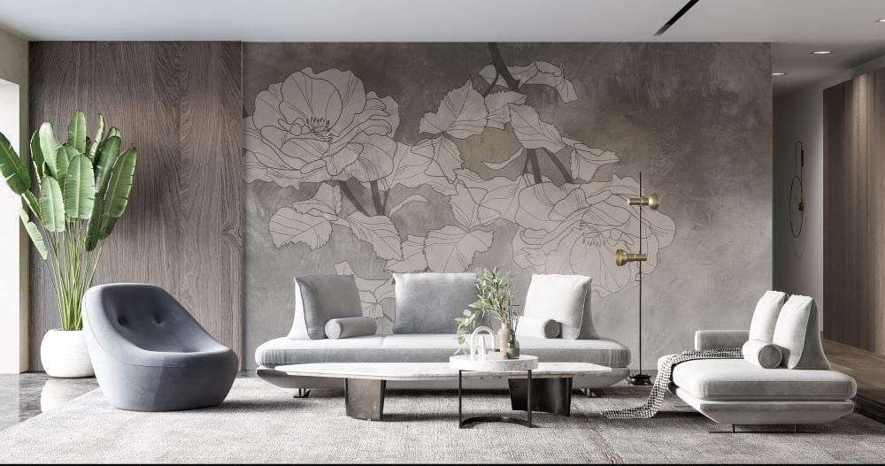 Siyah Beyaz Çizim Şakayık Çiçekler Duvar Kağıdı