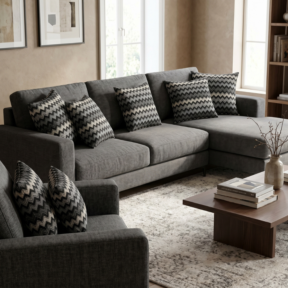 Zamansız siyah ve beyaz tonların kusursuz uyumuyla tasarlanan bu dekoratif yastık, modern yaşam alanlarına güçlü ve sofistike bir dokunuş kazandırır. Zigzag desenin ritmik yapısı sayesinde bu yastık, sade renk paletiyle birleşerek dengeli ve şık bir görünüm sunar.