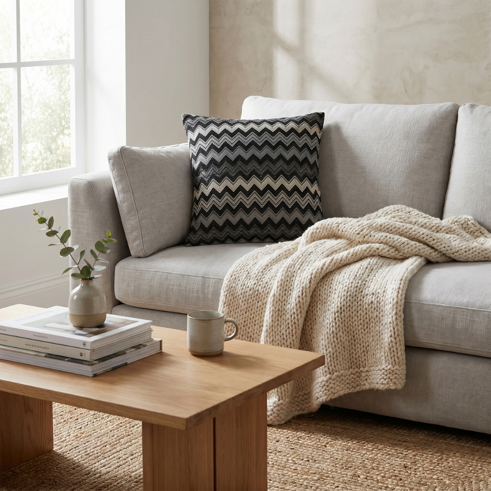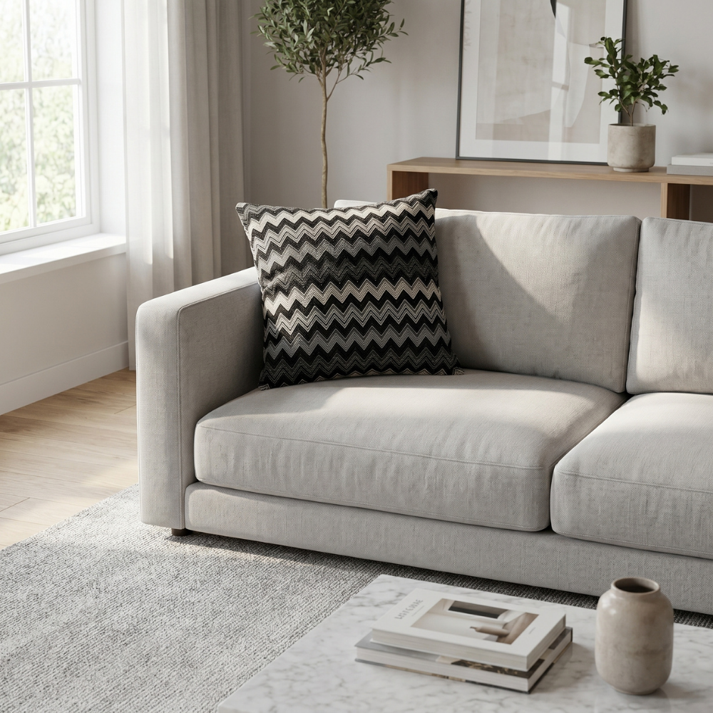 Zigzag (chevron) desenin net geometrisi ile siyah ve beyaz tonlarının kontrast uyumu birleşerek mekâna modern ve zamansız bir atmosfer kazandırır. Bu özel tasarım yastık, minimal ve klasik dekorasyon anlayışını bir araya getiren güçlü bir stil sunar.