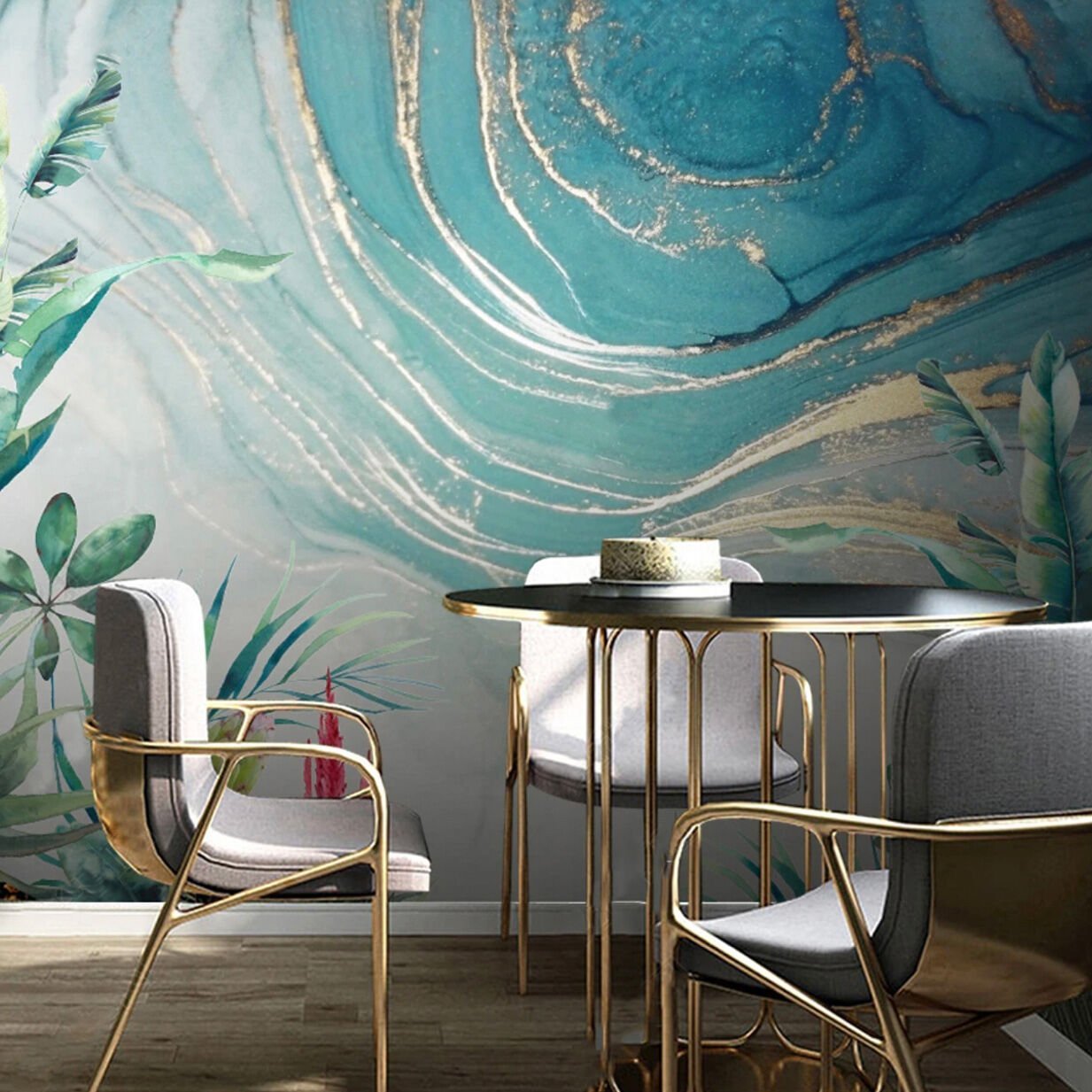 Su Dalgası Tropik Yapraklar Gold Detaylı Duvar Kağıdı