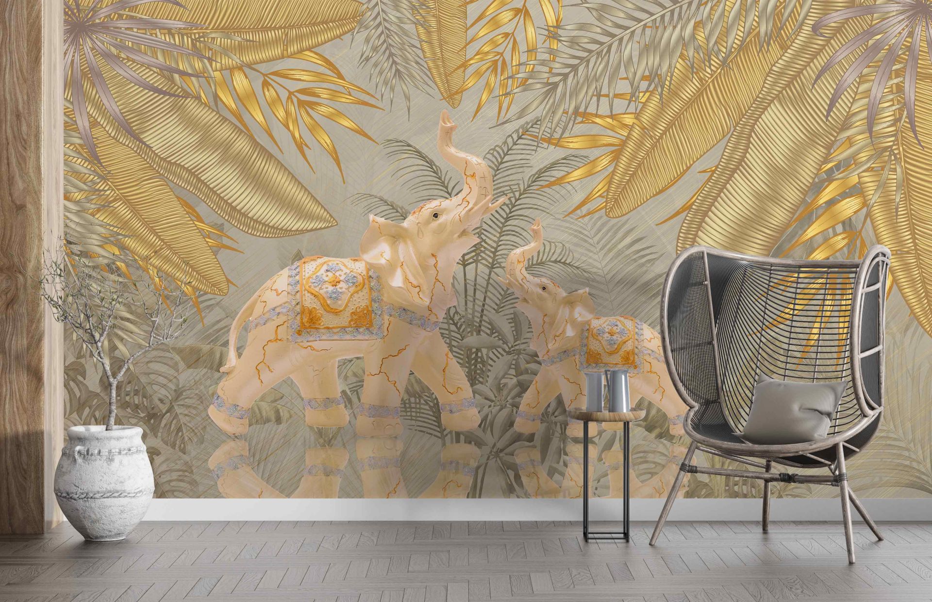 Tropik Altın Yapraklar Altın Detaylı Filler Duvar Kağıdı