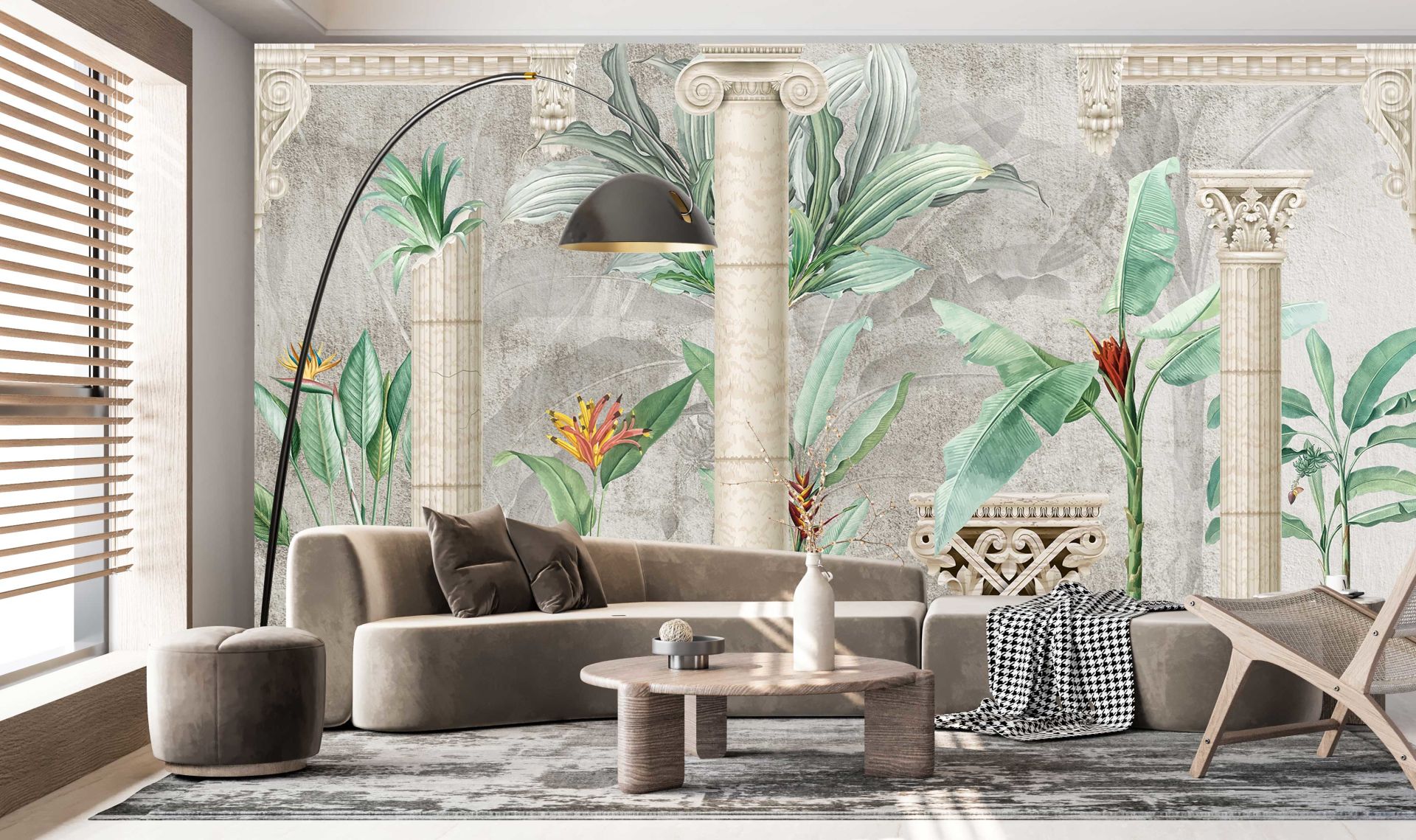Tropik Çiçekler Önünde Sütunlar Duvar Kağıdı