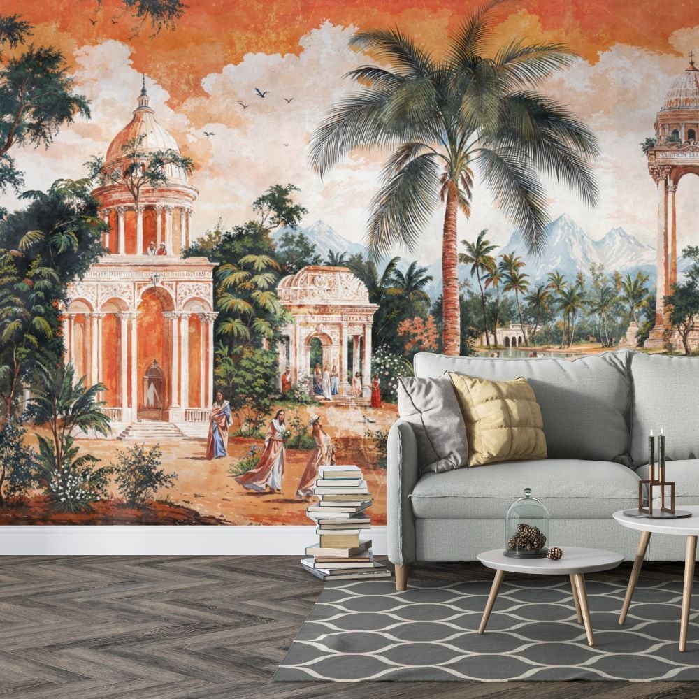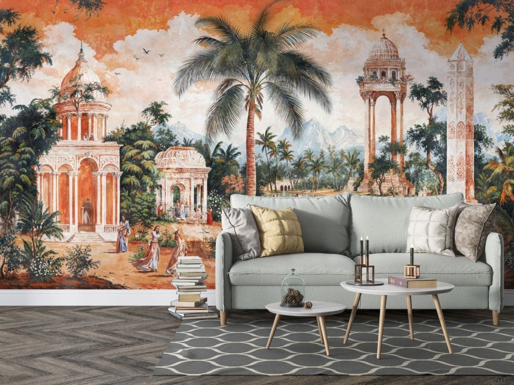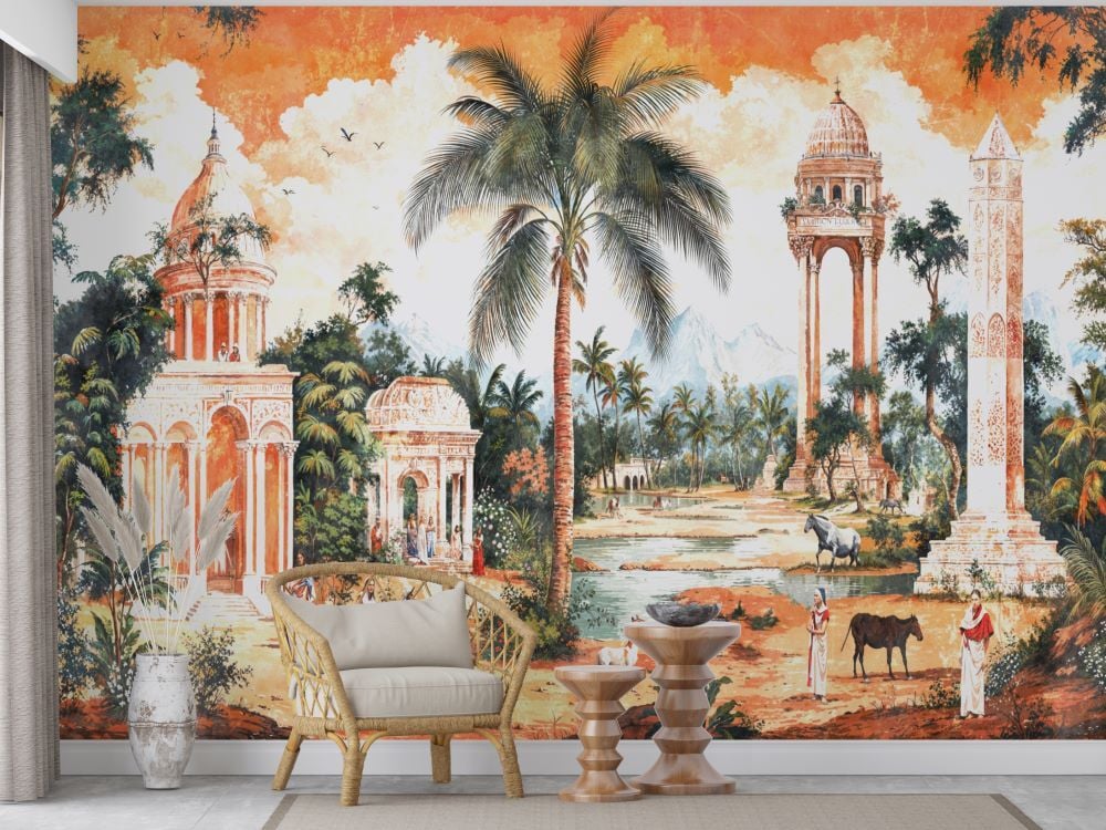 Tropik Manzara Duvar Kağıdı Turuncu Zeminli Antik Mimari Wallpaper,Klasik Saray Desenli Duvar Posteri.Egzotik Temalı İç Mimari Kaplama, Palmiye Ağaçlı Manzara Duvar Kağıdı, El Çizimi Etkili Dekoratif Wallpaper, 3D Tarihi Sahne Manzar Duvar Kağıdı.