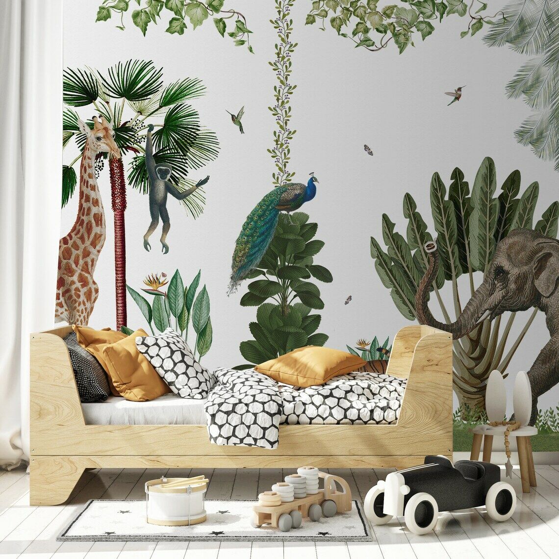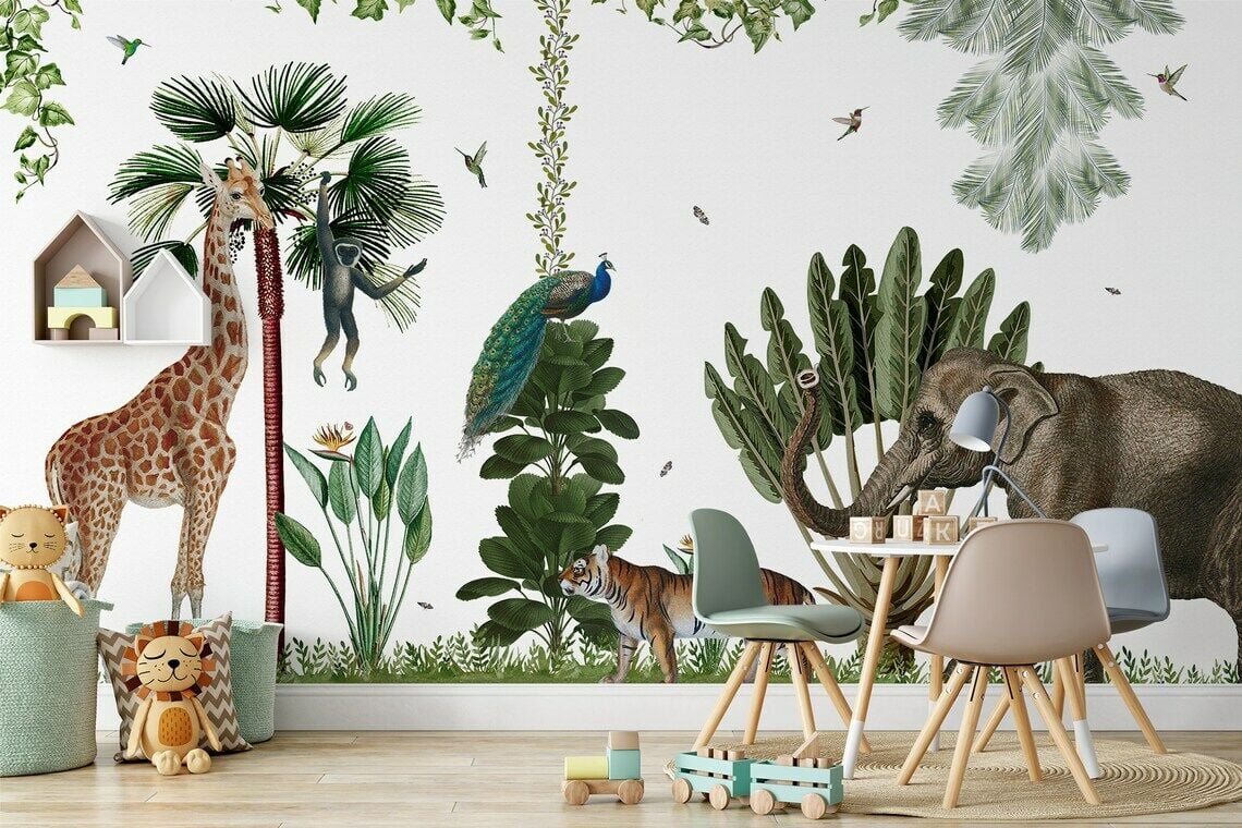Tropikal Bitkiler Zürafa Fil ve Kuşlar Duvar Kağıdı