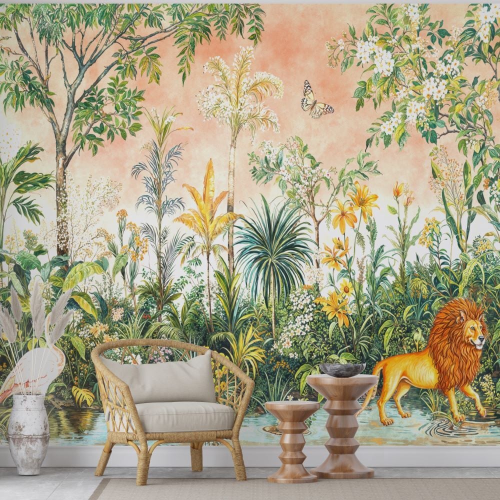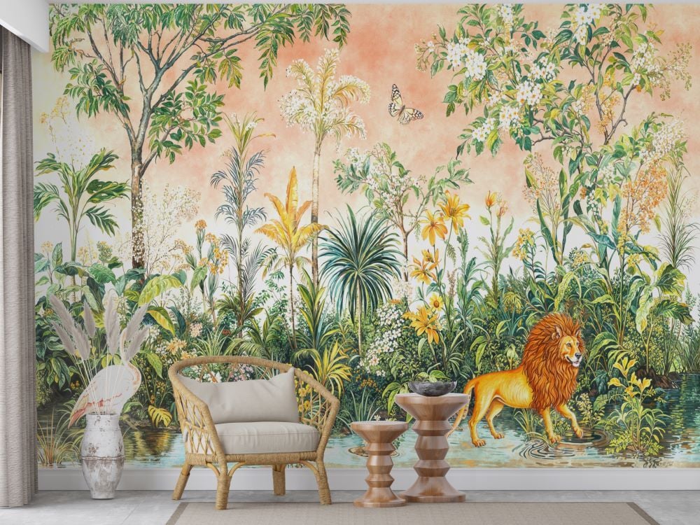 Tropikal Orman Ve Aslan Desenli Duvar Kağıdı