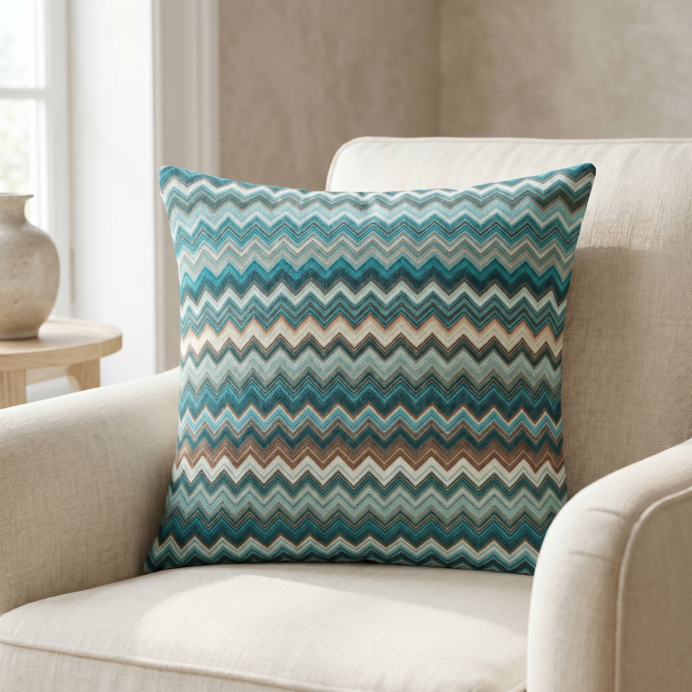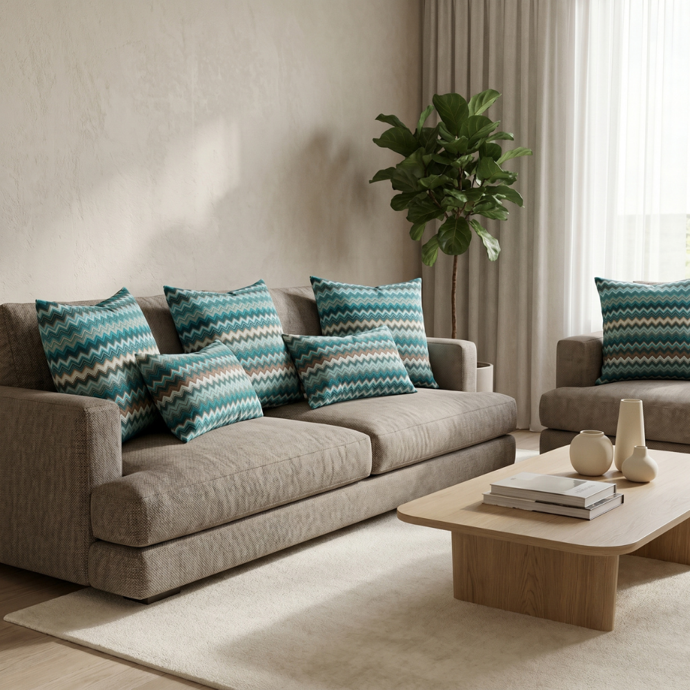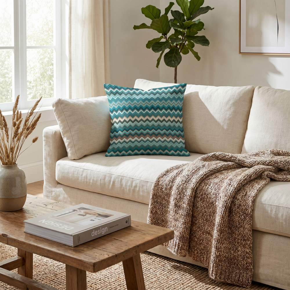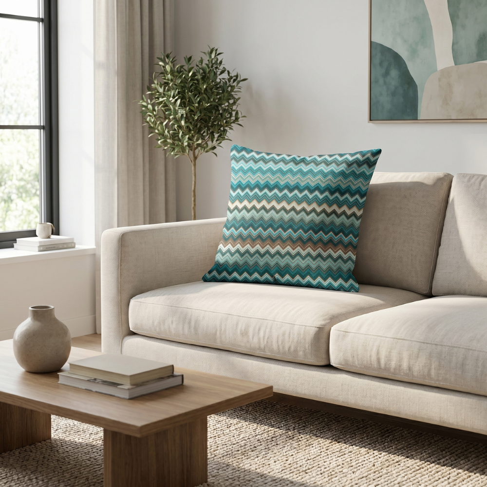 Turkuaz ve bej tonlarının ferah uyumuyla tasarlanan bu özel dekoratif yastık, yaşam alanlarına sakinlik ve zarif bir enerji kazandırır. Yatay formda ilerleyen zigzag desenler sayesinde bu yastık, yüzeyde ritmik bir akış oluştururken turkuaz tonlarının serin etkisi mekâna taze bir görünüm katar.