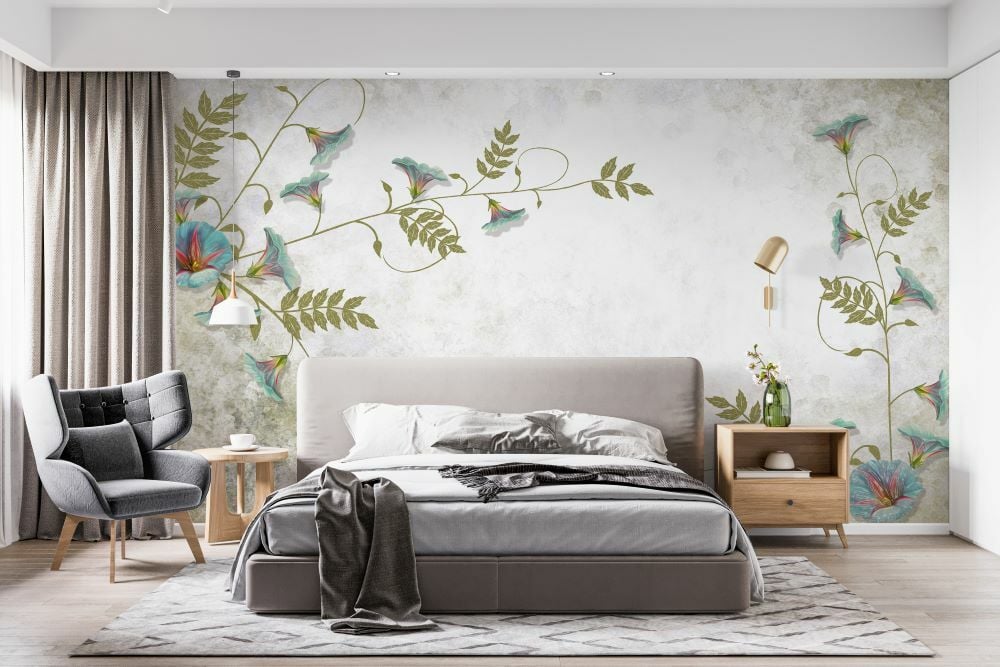 Turkuaz Mini Japon Çiçekleri Duvar Kağıdı