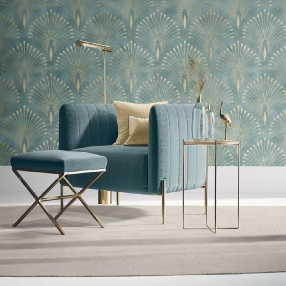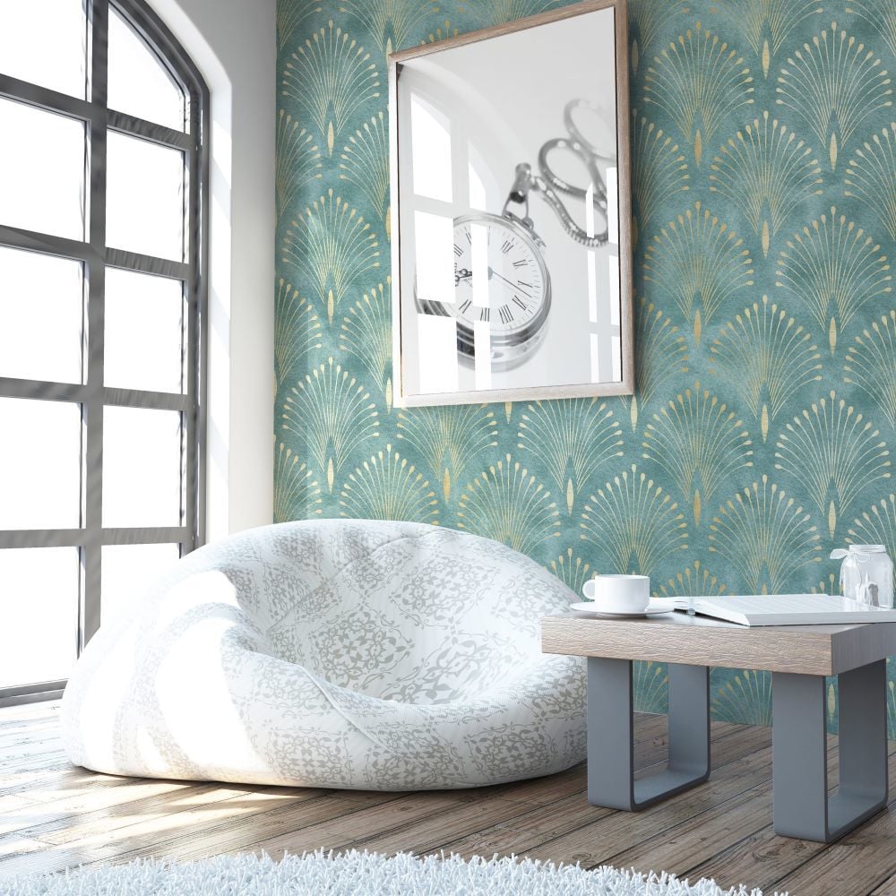 Turkuaz Soft Gold Detaylı Geometrik Desen Duvar Kağıdı