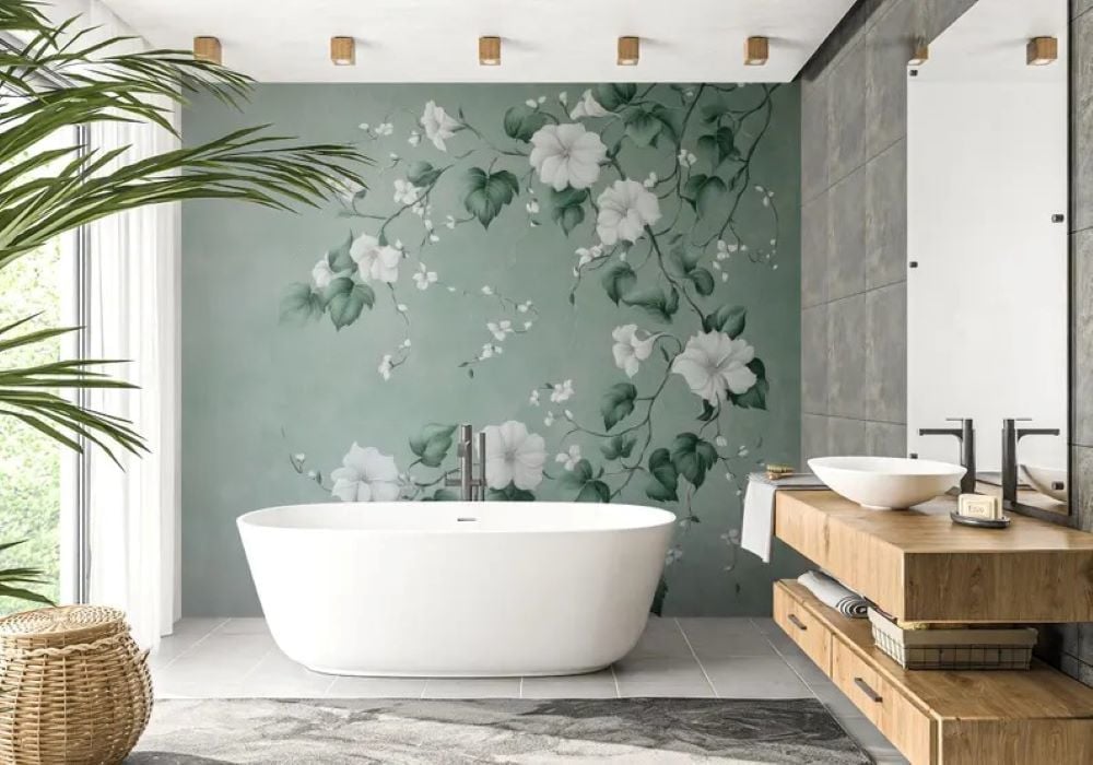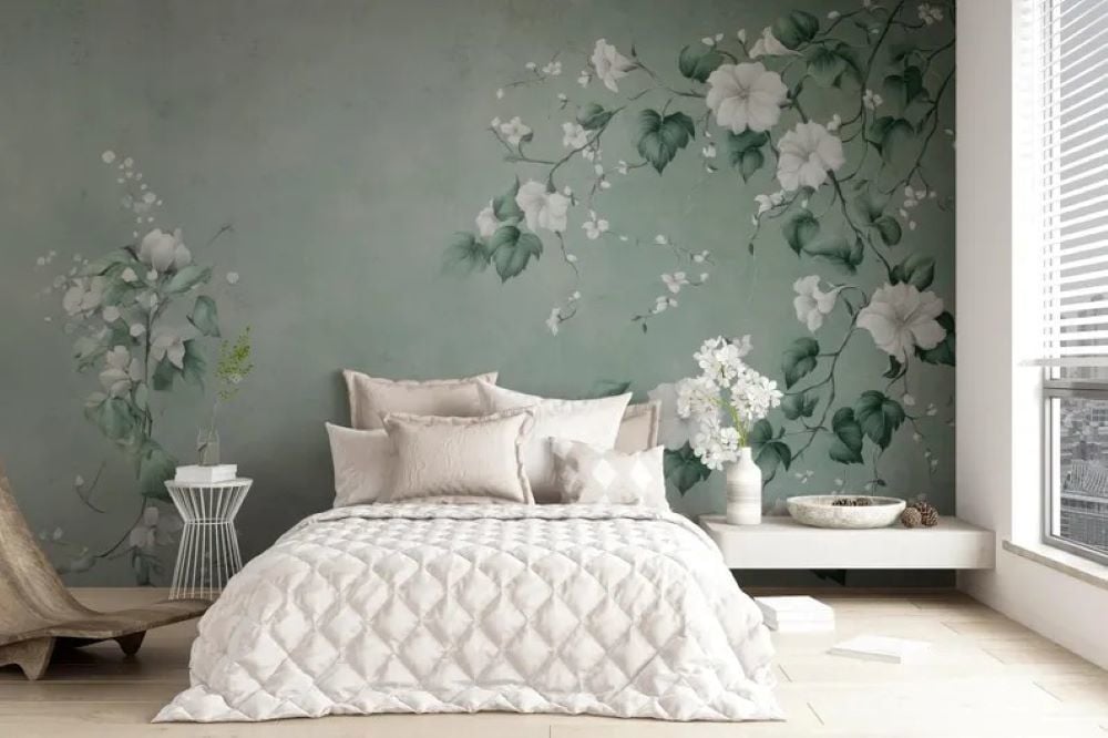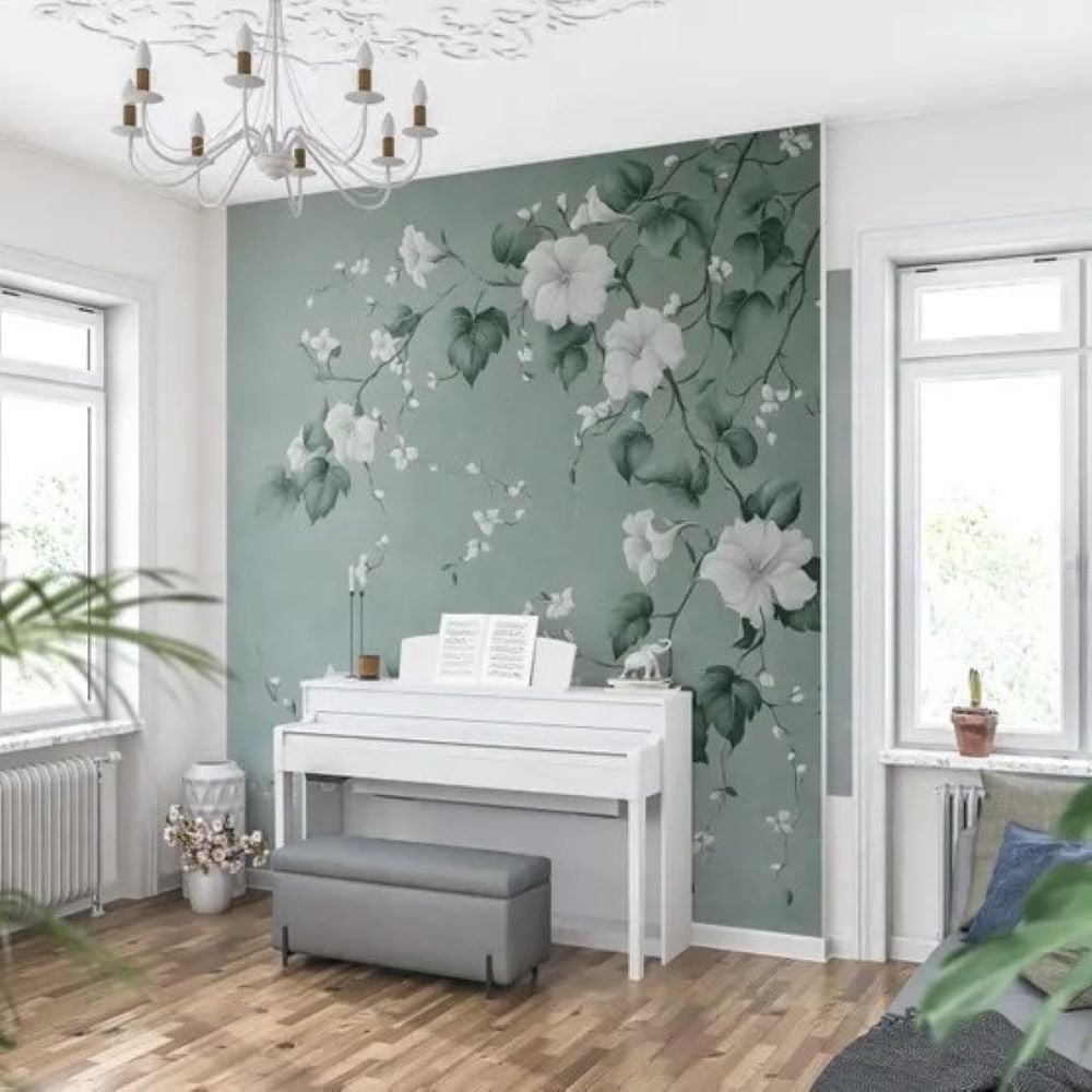 Turkuaz Soft Zemin Sarmaşık Çiçekler Duvar Kağıdı