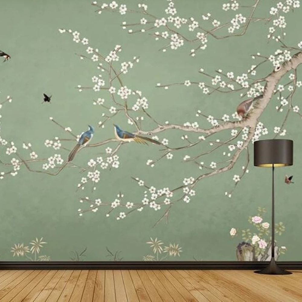 Mint Yeşili Zeminde Çin Gülü Ve Kuşlar Duvar Kağıdı