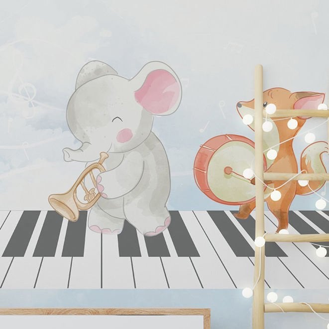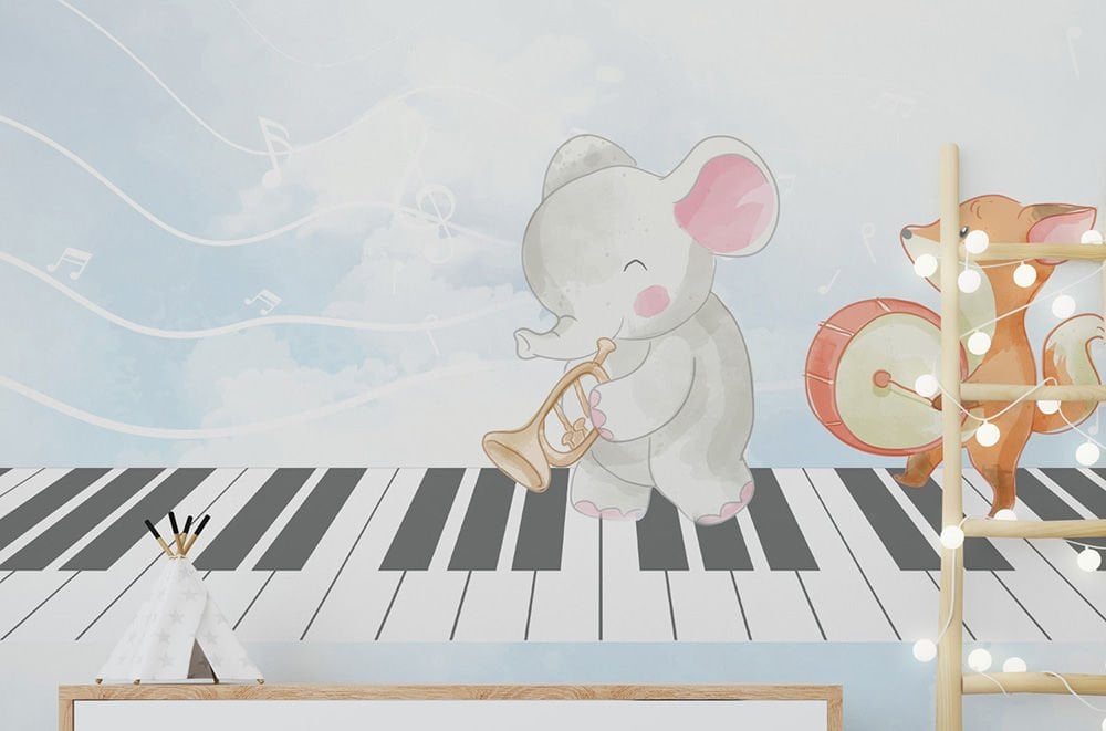 Piyano Üzerinde Fil Tavşan Mavi Fon Duvar Kağıdı
