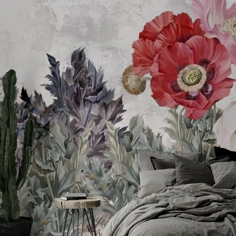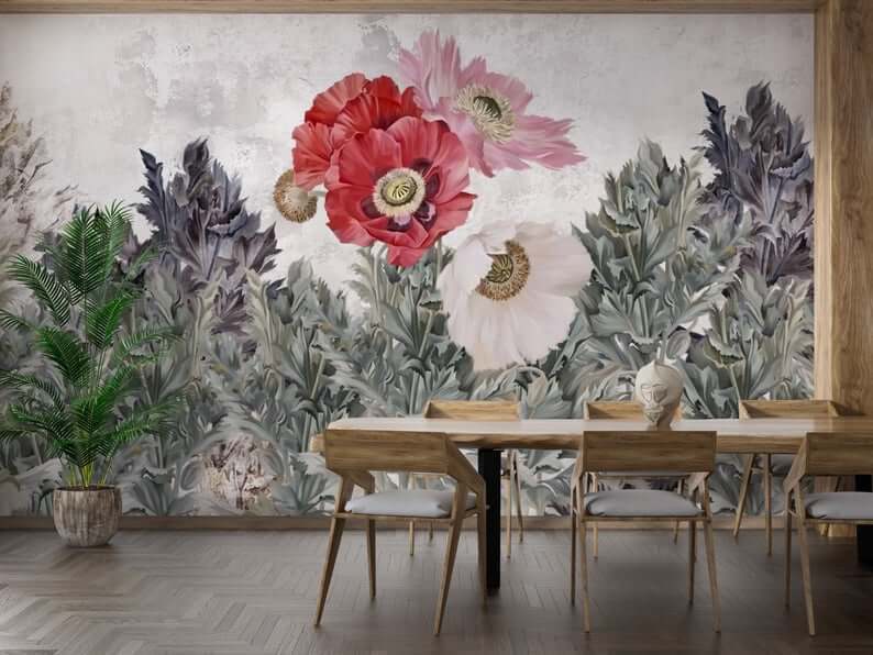 Uva Vizon Zeminde Suluboya Efektli Haşhaş Çiçeği Duvar Kağıdı