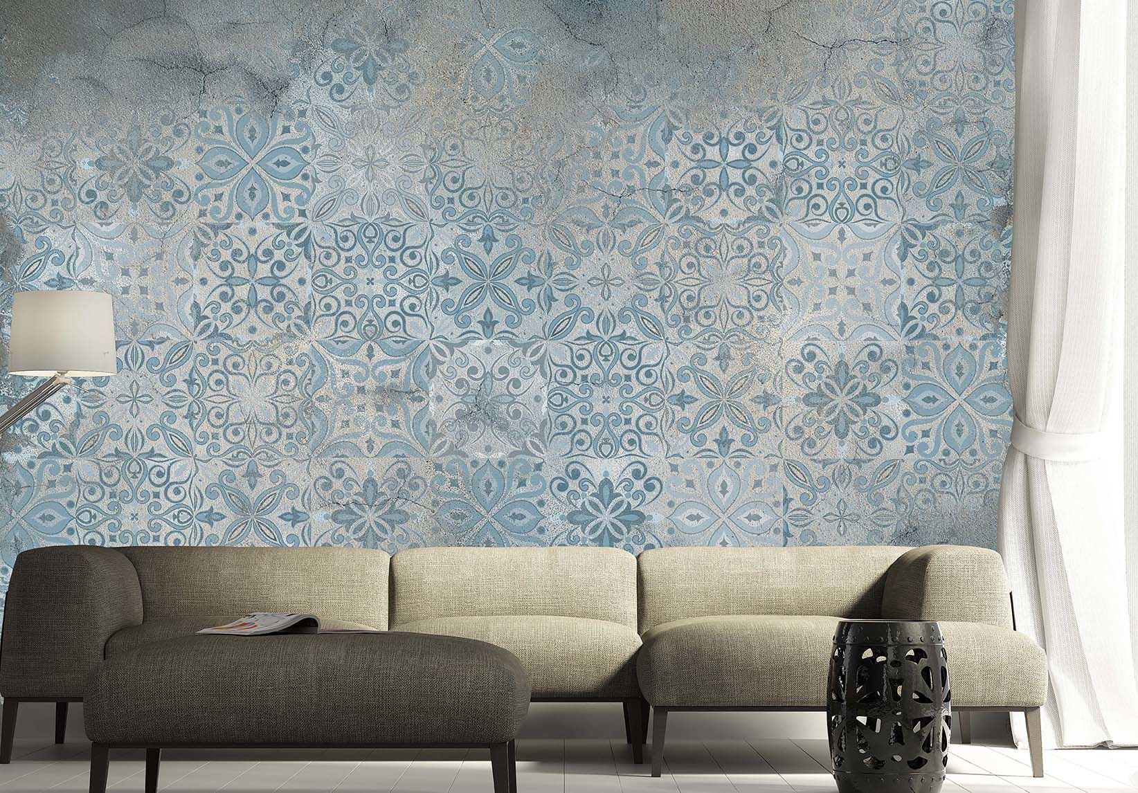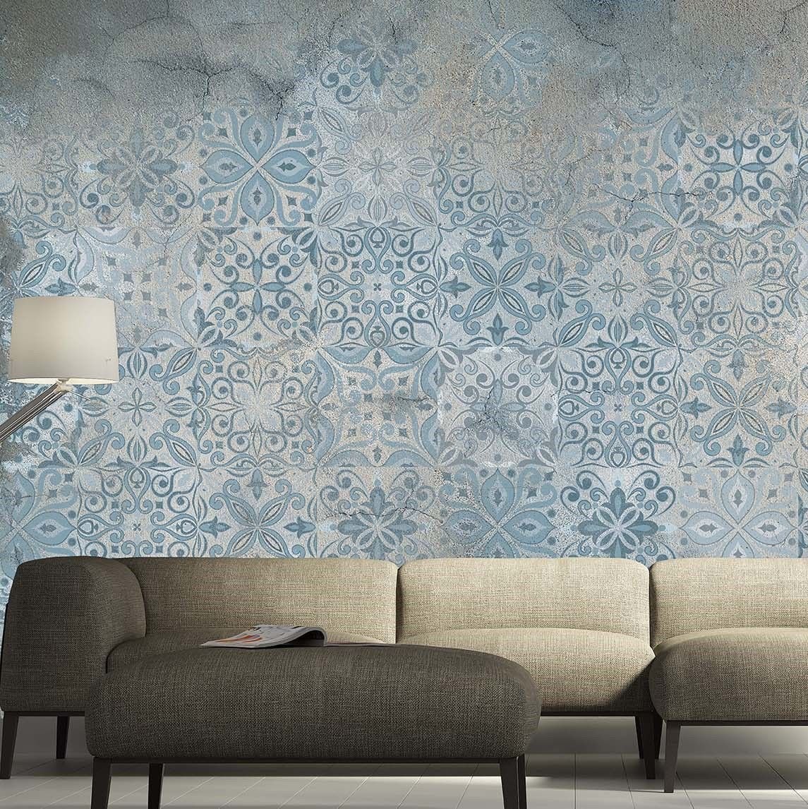 Vıntage Karo Mavi Etnik Desen Duvar Kağıdı