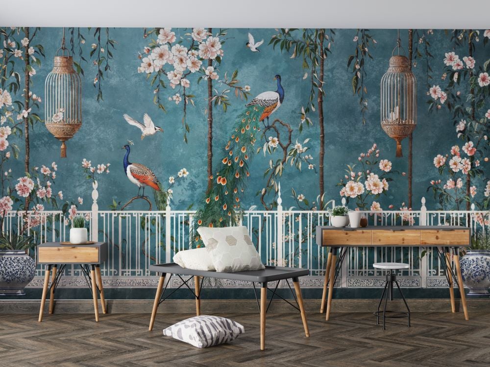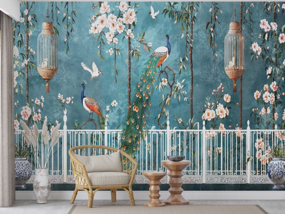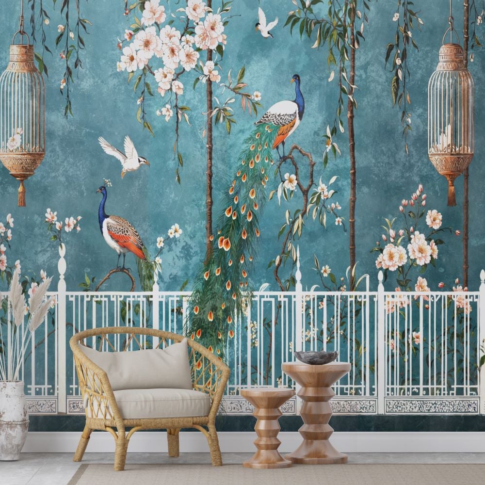 Zümrüt Bahçesi Tavus Kuşlu Sanatsal Duvar Kağıdı